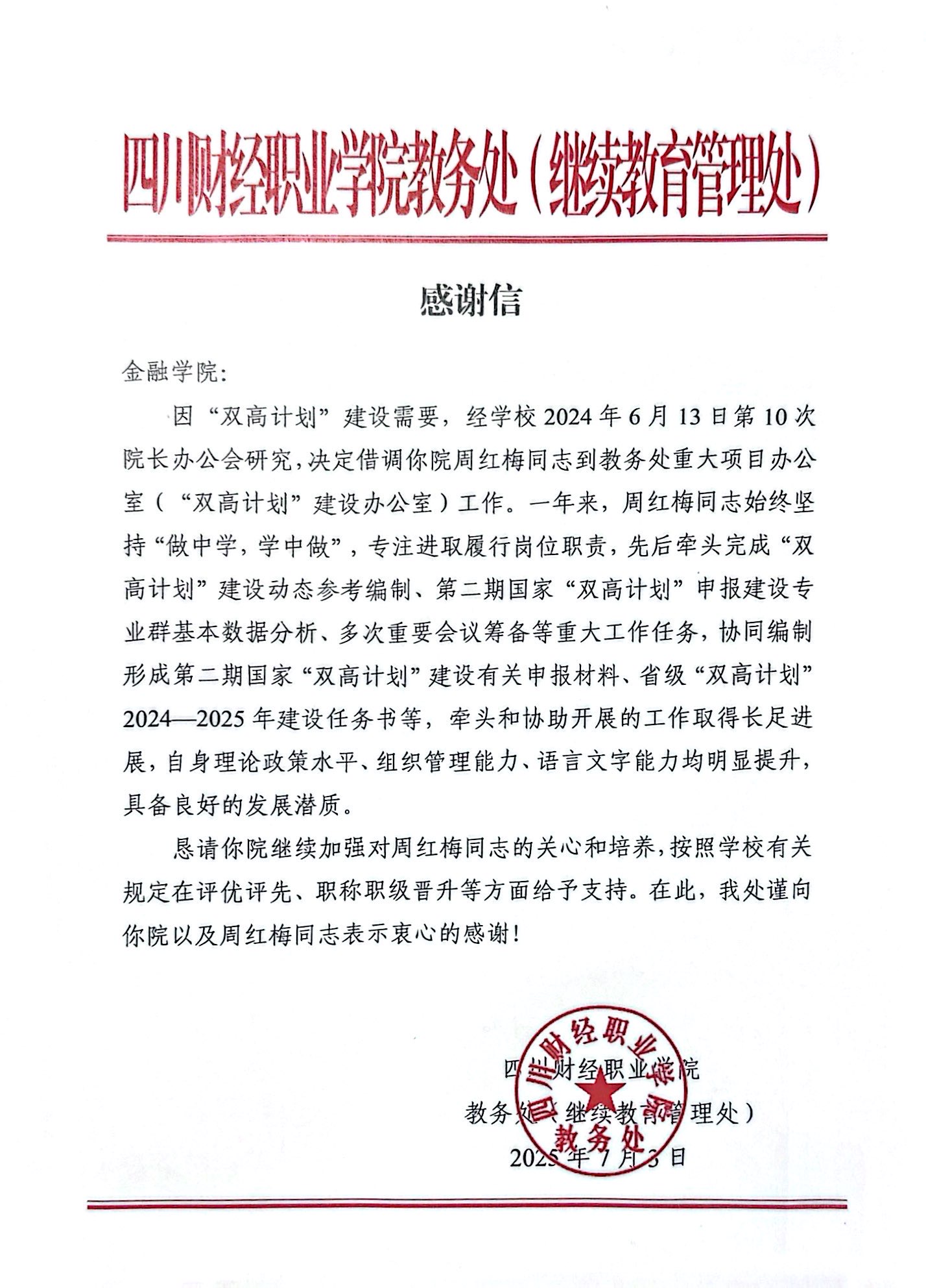 2025年7月3日,金融学院收到了来自四川财经职业学院教务处的感谢信,信中对周红梅同志在借调教务处重大项目办公室(“双高计划”建设办公室)期间突出的工作表现给予充分肯定。根据工作安排,周红梅同志从2024年6月开始借调教务处重大项目办公室参与相关工作,并于近期完成工作...