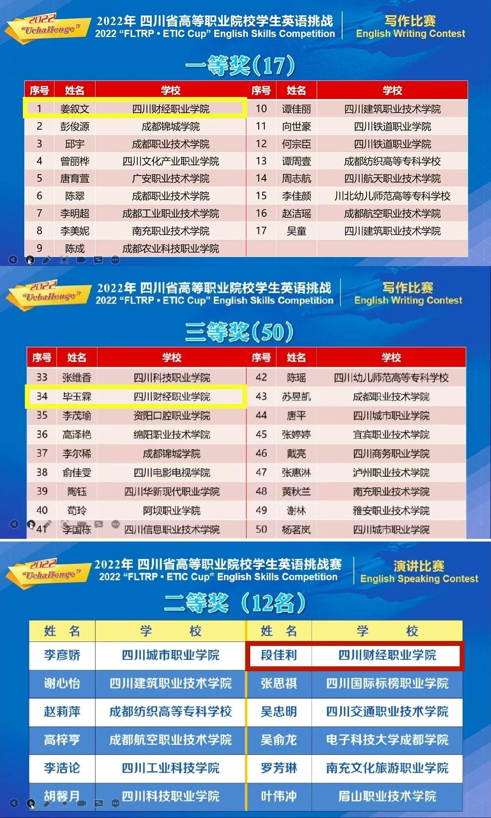 2022年Uchallenge四川省高等职业学校学生英语挑战赛四川省决赛于10月29日到10月30日在线上举行。本次大赛由四川省教育厅主办,为2022年“四川省职业院校技能大赛”赛项,四川省66所高等职业院校226名选手参与到了此次大赛。该赛事分为英语写作比赛和英语演讲比赛两项,主要考查学生的英语书面、口头...