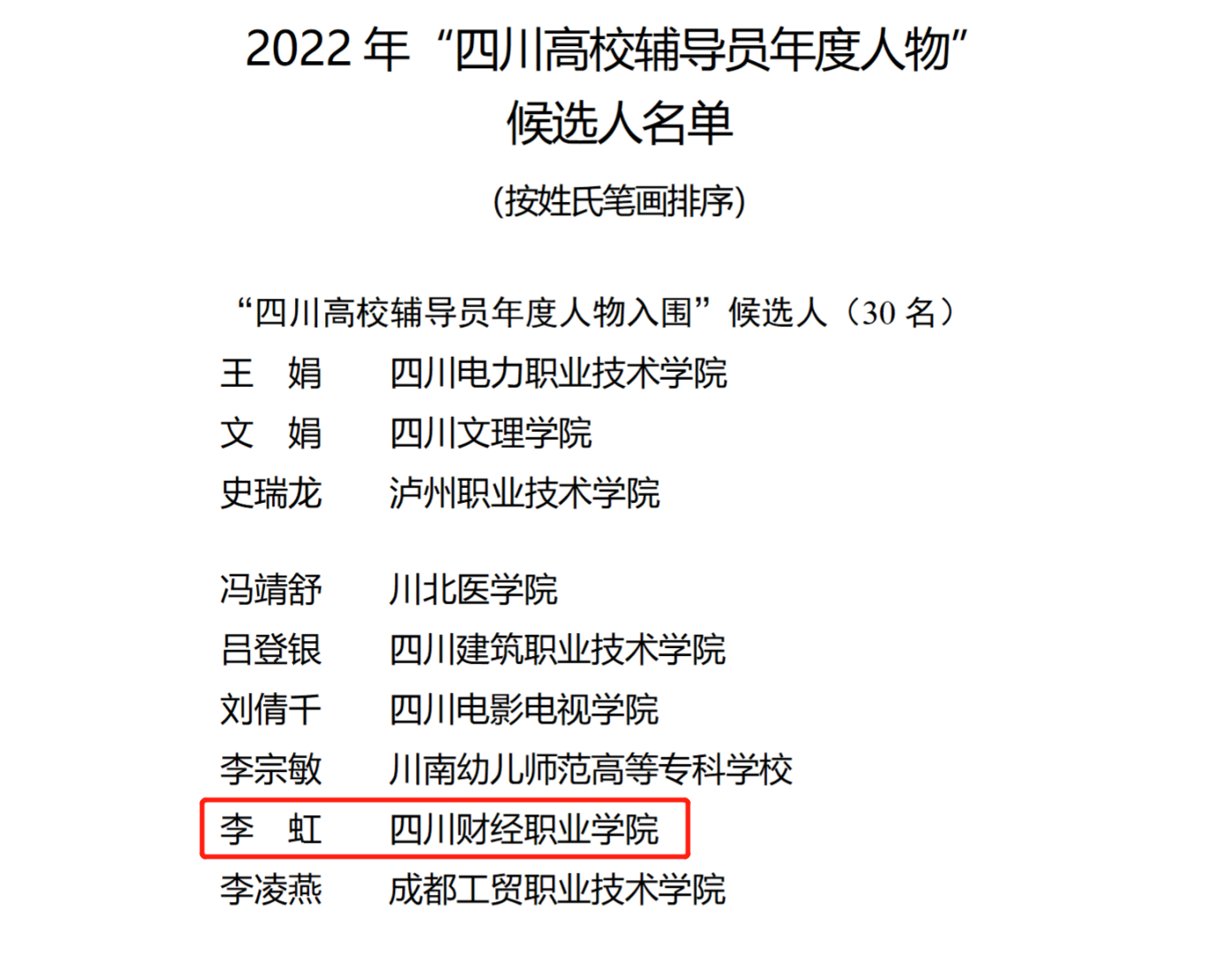 近日,四川省教育厅公布了2022年思政工作“年度人物”评选活动结果,经组织推荐、资格审查、专家评审,金融学院辅导员李虹入选“四川高校辅导员年度人物入围”候选人。李虹现任四川财经职业学院金融学院党总支副书记,于2008年开始从事大学生思政教育,至今13年,共担任过10多个班级共计700多名学生...