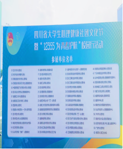 5月24日,四川省大学生心理健康社团文化节暨“12355为青春护航”校园行活动在成都理工大学举行。本次活动由共青团四川省委、四川省教育厅共同主办,全省137所高校团委负责人、心理健康中心负责人、学生心理健康社团负责人以及青少年心理健康关爱社会组织负责人共400余人参加,我校作为54所参展高校之一参加了“大学生心理健康市集”和“心理健康社团交流”等系列活动。