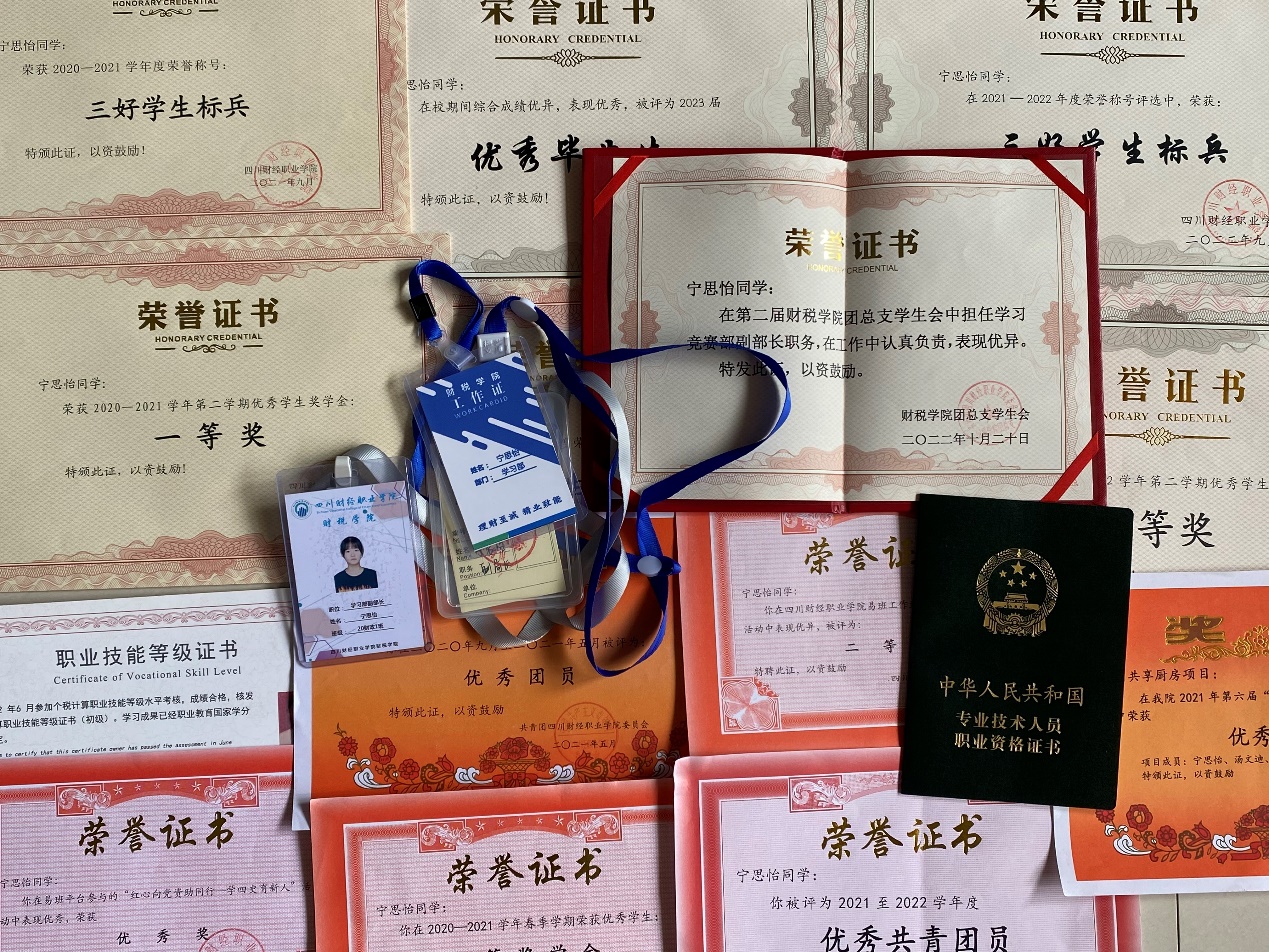 2020年,宁思怡进入四川财经职业学院,成为财税学院2020级财政1班的一名学生。一进入川财,她决心把生活的重心聚焦在个人能力提升上,先后成为了院英语协会干事、院学习部干事。青春年华就该拼搏奋斗、埋头苦干,她始终牢记“业精于勤,荒于嬉,行成于思,毁于随”。为此,她刻苦学习,严格自律。