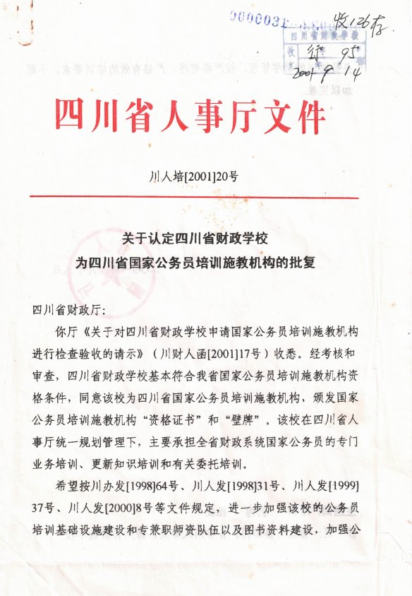2001年向四川省人事厅申请建立“四川省国家公务员培训施教机构”,5月获得公务员培训资格,并正式批准在我校建立“四川省国家公务员培训施教机构”。