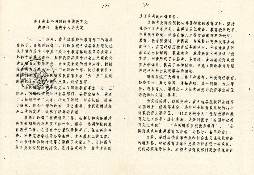 财政部《关于表彰全国财政系统教育先进单位、先进个人的决定的通知》