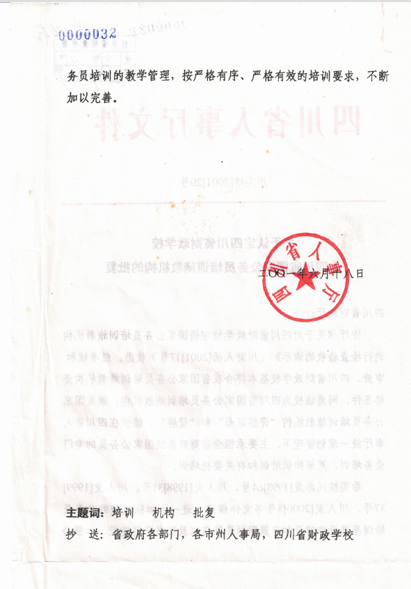 川人培〔2001〕20号 关于认定四川省财政学校为四川省国家公务员培训施教机构的批复