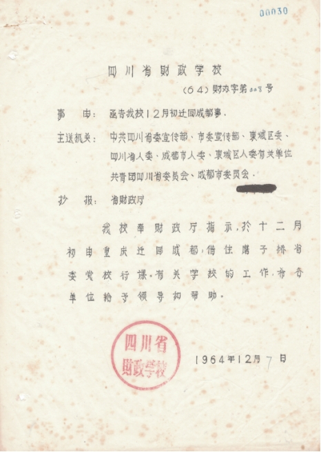 1964年四川省财政学校正式开始招生,于1964年7月10日左右分赴成渝两地,先后开始录取至8月15日胜利结束。因为财政系统急需干部,所以按照财政厅要求,学校招收了三年制中专生403人,1964年应届高中毕业生323人进行短期培训,以迅速补充财政干部的缺额。