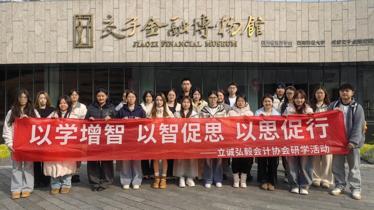 为厚植家国情怀、传承红色财经基因,2025年12月2日下午,立诚弘毅会计协会组织师生赴交子金融博物馆开展研学活动。本次活动由会计教研室党支部、审计教研室党支部及会计学院团总支学生会联合主办。在博物馆中,师生们沿着“交子”诞生的历史脉络,不仅梳理了货币形态的演变,还深入了解了其中蕴含的早期信用体系、账务记录雏形与金融创新实践。这延续千年的智慧,正是中国财经事业自力更生、严谨务实传统的源头活水,也与红色财...