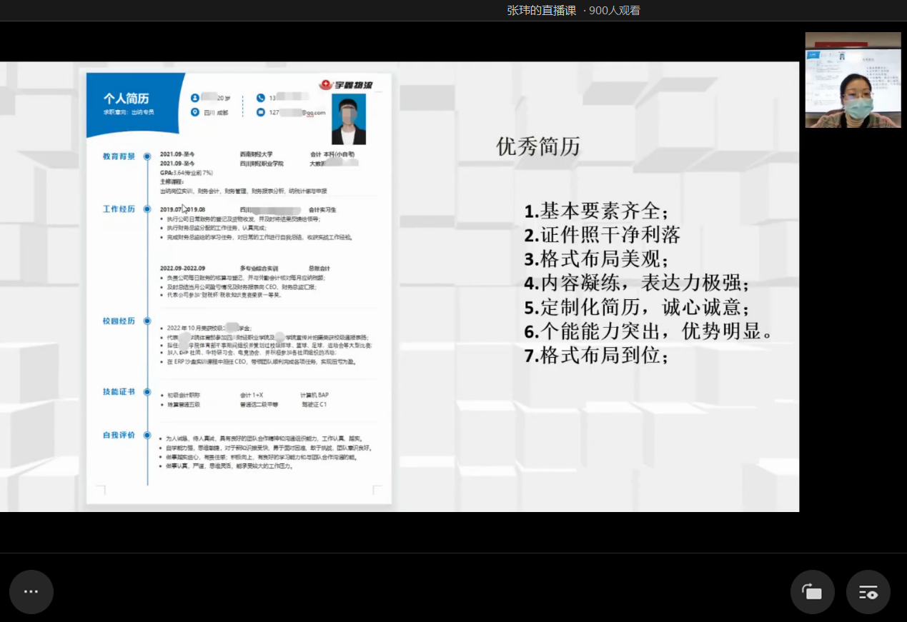 简杰老师向同学介绍了简历的制作方法。她指出,简历是一种自我营销的工具,体现个人职业设计的驱动力,可以在应聘过程中争取到更多的机会。她表示,同学们在制作简历时,最重要的不在于简历本身,而在于简历创作背后的目标定位、职业规划。应注重凸显这些方面的信息,传递自身的想法和规划,充分体现自身的优势,提炼出吸引招聘方的应聘者特质与能力。