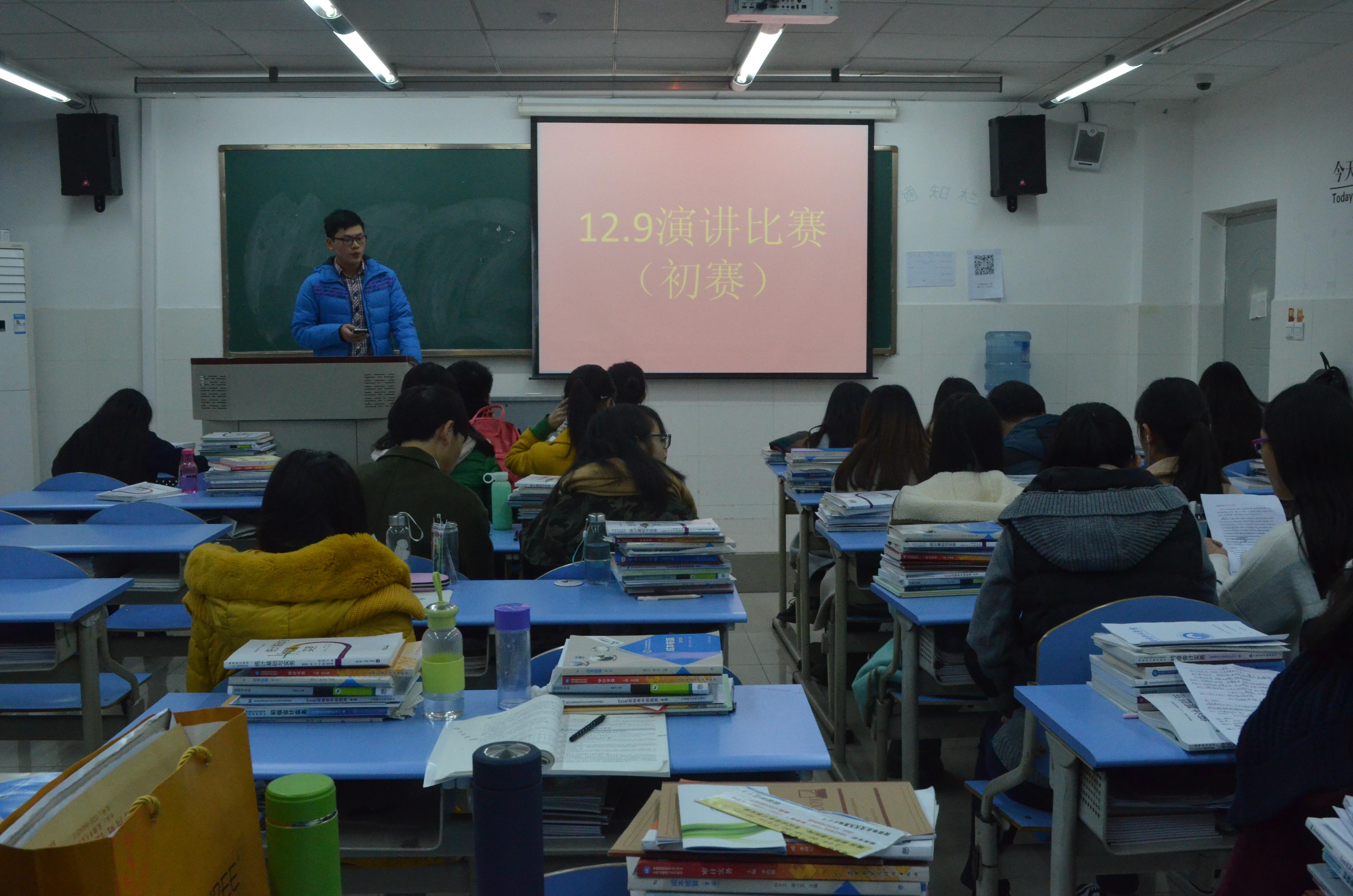 为了纪念一二九抗日救亡运动,弘扬爱国主义精神,2016年12月1日,我系在c107举行了12.9演讲比赛初赛。本次演讲比赛特邀我系团副赵雪玉、秘书长陈敏等各位部长担任评委。