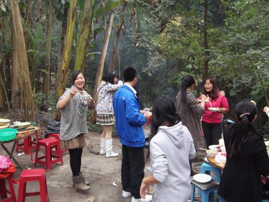 终于到了百工堰,它很大,美丽的景色深深的吸引了我们。我们沿途欣赏着风景,到了野炊区。大家开始其乐融融的洗菜、切菜、生火等。当烧烤和火锅好了,大家到处窜,拿着碗到处吃,热闹的气氛弥漫了整个野炊区,所有人吃的好满足,玩的也很尽兴。