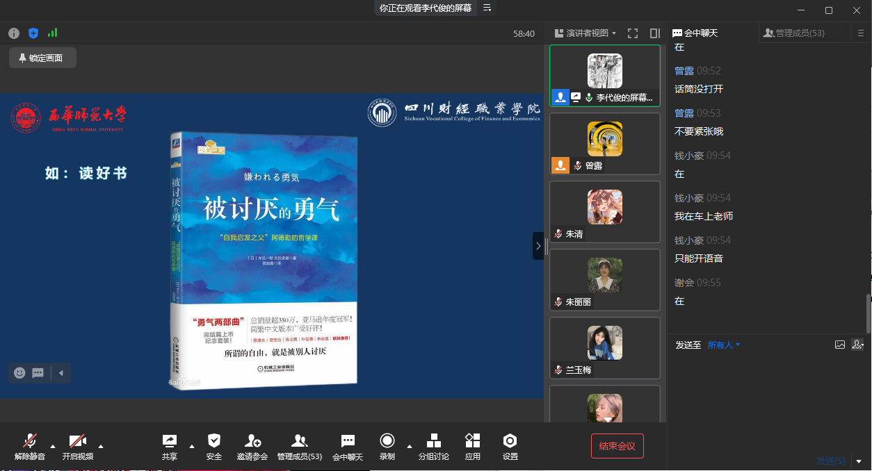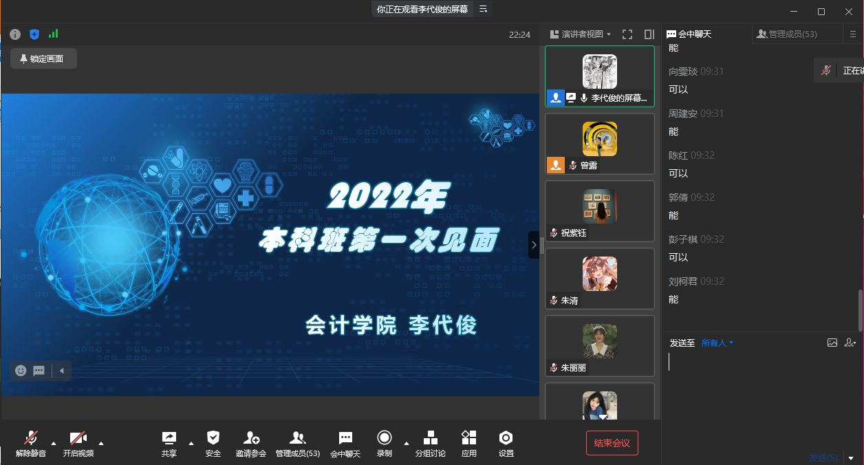 为加强22级本科班新生与班导师之间的交流,解决大学学习生涯的疑惑,培养新生积极进取的精神。2022级本科班于2022年9月9日举办线上班导师会议,学院党委书记张华、会计学院院长李代俊、2022级本科班辅导员曾露、2022级本科班全体同学出席会议。