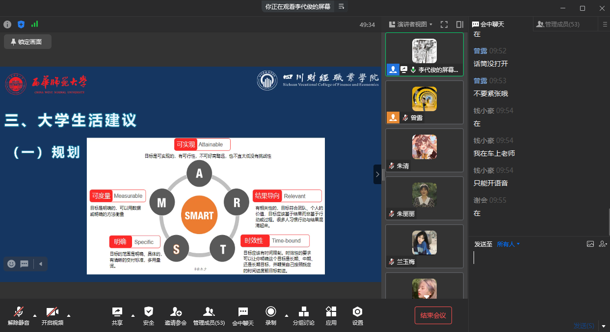 最后,李代俊院长为大家提出了大学生活方面的建议,一是学会规划,尽快融入大学生活。以可实现为基础、结果为导向,制订一份具有可度量性、明确性、时效性规划,将会为大学生活锦上添花。二是不忘初心,努力砥砺前行。大学不是学习的终点,而是人生学习、生活的另一个起点。要牢记“立身百行,以学为基”的宗旨,向老师学、同学学,在书本中翱翔、在实践中探索、在坚守中前行、在风雨中成长。三是找到合适的学习方法。充分利用学校里的资源和搜索引擎,主动预习、深度学习、独立思考、及时复盘,做自己的主人走出目标盲区。同时李代俊院长也为大家推荐了许多值得阅读的书籍,来辅助大家找寻目标、学会规划、适应学习、完善自我,同学们也表示受益匪浅。