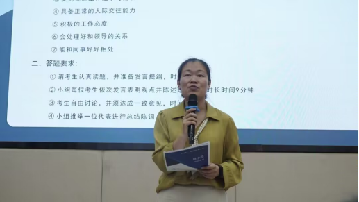 在无领导小组面试环节,九位参赛选手在现场工作人员带领下,进行无领导小组面试,本环节由面试官出题,三分钟自主思考,每人一分钟依次发言,所有人发言完毕后进行七分钟自由讨论,最后推选出一名代表进行两分钟的总结发言。