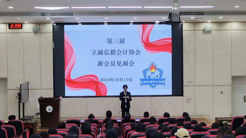 桂香飘然间,故里逢秋时。为给协会注入新鲜血液,吸纳更多优秀人才,更好地奠定协会基础,促进协会的发展。2024年10月10日下午13时,第三届立诚弘毅会计协会新会员见面会在至诚楼B213隆重举行,出席见面会的有会计学院党总支书记郑代富,会计学院副院长曾海帆,会计学院团总支书记罗兰杰以及协会的指导老师们,还有第三届全体新会员和老挝留学生班会员。见面会由立诚弘毅会计协会会长何涛主持。