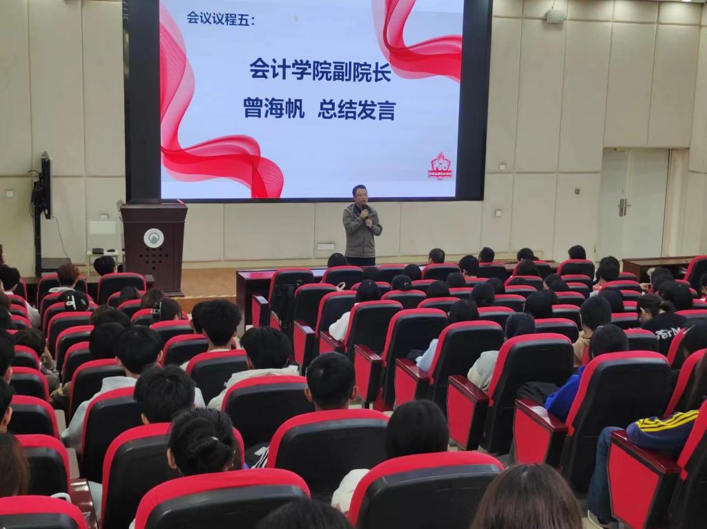 会议议程第五项,会计学院副院长曾海帆发言。曾海帆副院长首先表达了对新会员的热烈欢迎以及对协会组织者的充分肯定。指出了协会是一个能锻炼自己的地方,鼓励同学们积极参与协会的各项活动,建议会员们多交流,不仅要和不同班级,年级同学进行交流,还要与老挝班的同学们进行交流,促进中国与老挝的友谊发展。最后,曾海帆副院长对协会的发展提出了要求,希望协会能够蒸蒸日上,成为会计专业的一面旗帜,引领着同学们在学术探索与实践交流中不断前行,开创协会更加辉煌的明天。