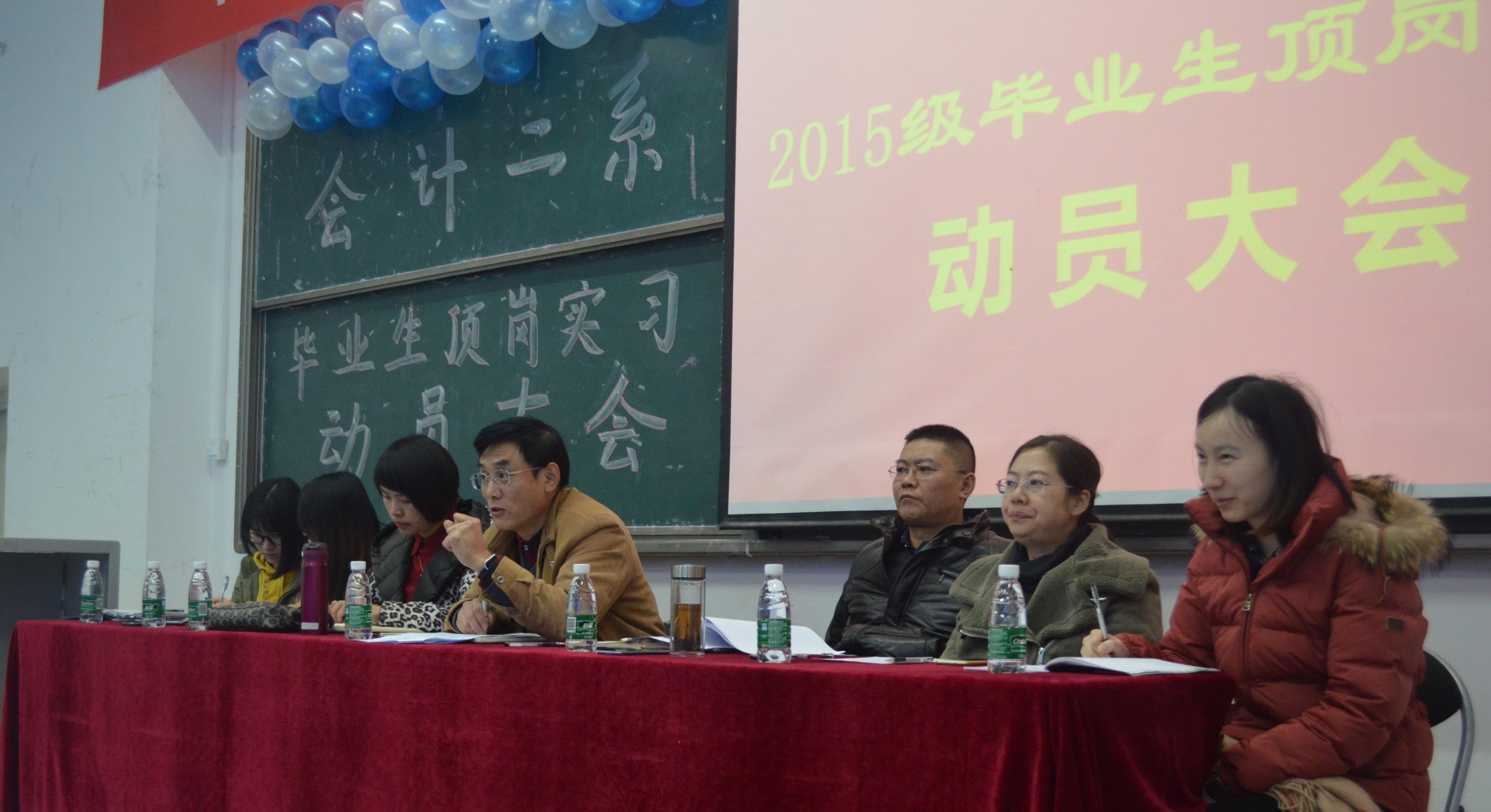 2017年12月6日下午3点30分,会计二系2015级毕业生顶岗实习动员大会在b212教室召开。出席本次会议的有系主任尹东、党总支书记刘波、学生党支部书记吴琳及15级部分辅导员老师与15级全体学生。