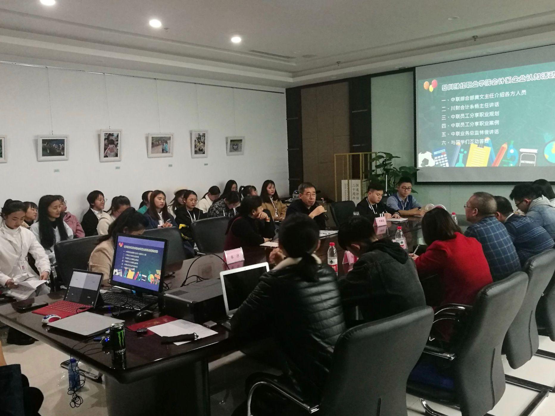为加强四川财经&中联教育现代徒制班同学们对企业文化的认同、熟悉企业工作流程。2019年11月21日下午,在对外合作处和会计一系的组织安排下,我院首届现代学徒制班(2019级会计10班)全体学徒赴中联资产评估集团有限公司西南分公司和中兴财光华会计师事务所四川分所开展企业认知活动。中联资产评估集团有限公司西南分公司业务总监林俊、行政部长黄文、辜冰、李馨妮,中兴财光华会计师事务所所长何朝宇、周旭。学院会计一系主任、副主任、干事、外合作处教师以及2019级会计10班全体同学参加了此次企业认知活动。
