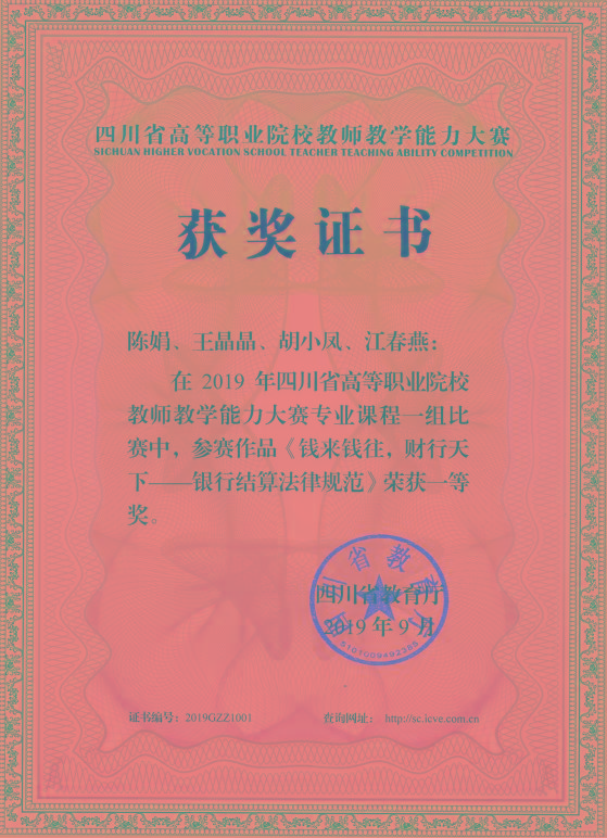 2019年四川省高等职业院校教师教学能力大赛于9月7—8日在成都航空职业技术学院举行,全省52所高职院校共遴选推荐388件作品参赛,经过网络评审,109个团队进入现场决赛,经过两天的激烈角逐。我系陈娟、王晶晶、胡小凤、江春燕团队《钱来钱往,财行天下——银行结算法律规范》获得一等奖。