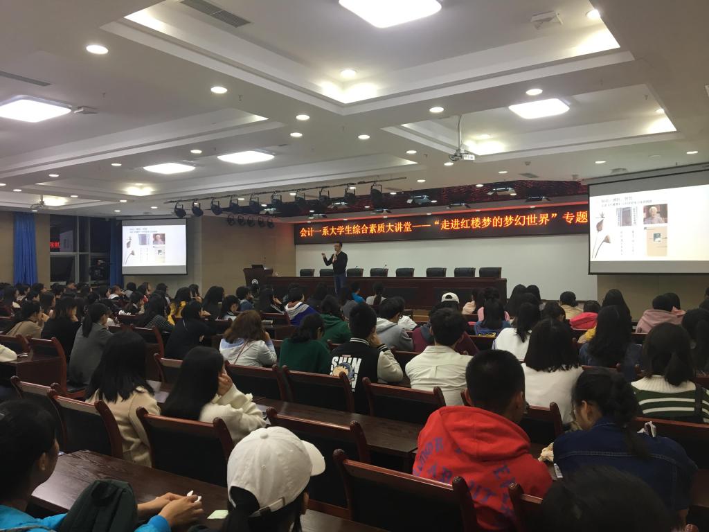 为提升大学生综合素养,开拓学生视野,弘扬中国传统文化,由会计一系主办,易班中心协办的会计一系大学生综合素质大讲堂——“走进红楼梦的梦幻世界”专题讲座在图书信息楼308室如期开展。讲座特邀红学研究专家、四川国际标榜职业学院马经义副教授主讲。