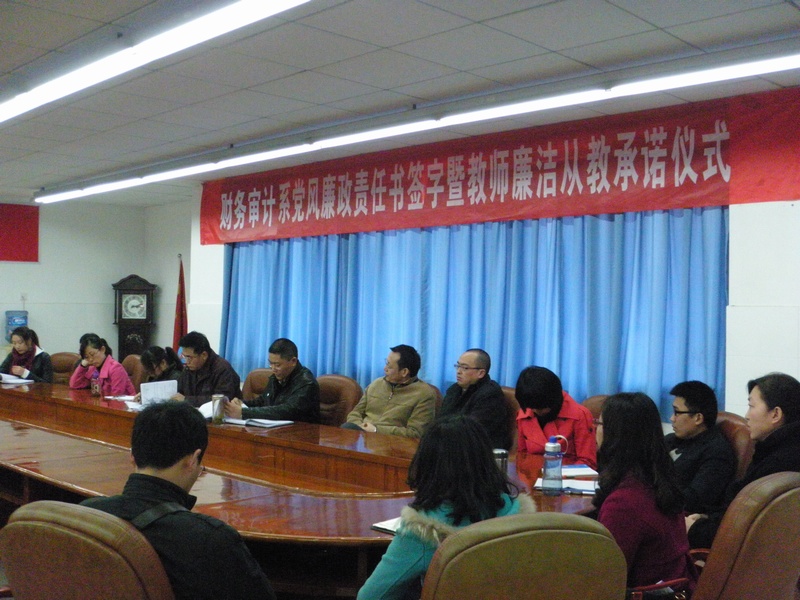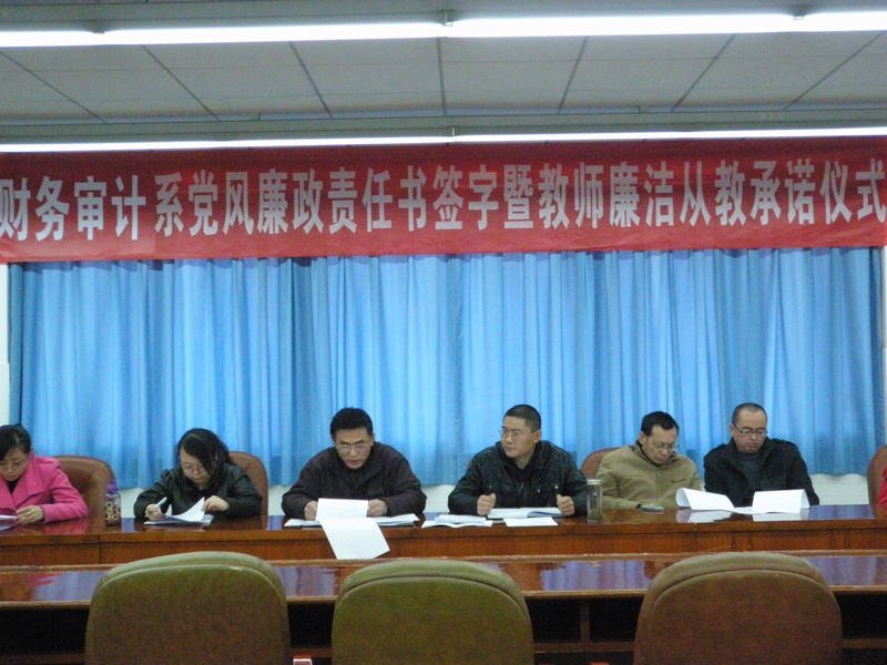 为进一步推动我系党风、教风、系风建设,增强党员的廉洁意识和党性观念,进一步提升教师职业道德,规范教师从教行为,按照学院党委和行政2011年工作部署和要求,我系于2011年3月29日在学院B509会议室举行了党风廉政建设责任书签字及教师“廉洁从教”师德承诺仪式。仪式由财务与审计系党支部书记刘波主持,系主任尹东及全体教师出席了仪式。