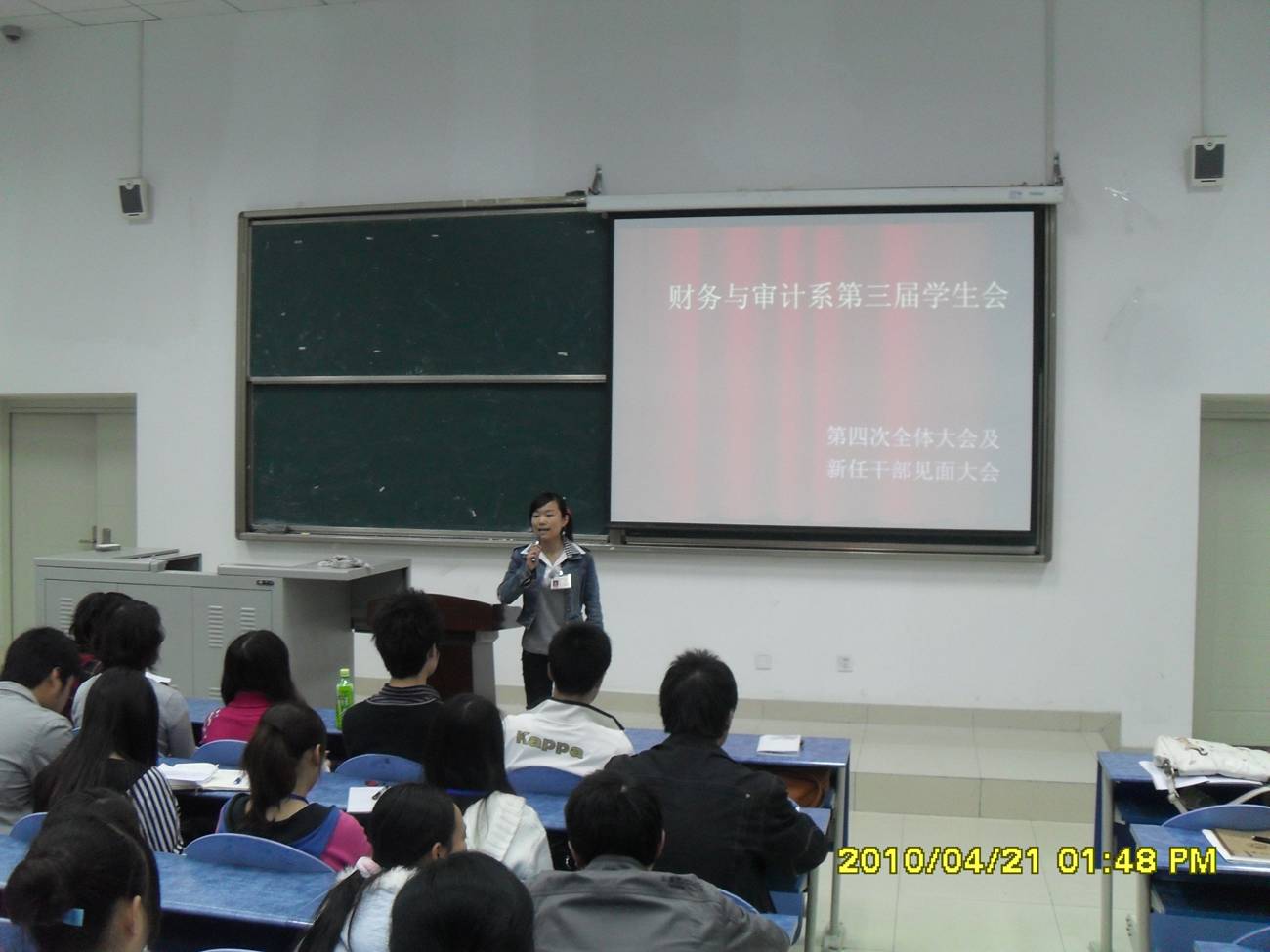 2010年4月21日星期三,财务与审计系学生会第四次全体大会及新任干部见面大会在B108成功召开。财务与审计系学生会全体成员以及各班班长、团支书参加了此次会议。在会议正式开始前,全体参会人员为玉树遇难同胞默哀2分钟,以表达对遇难同胞的哀思。