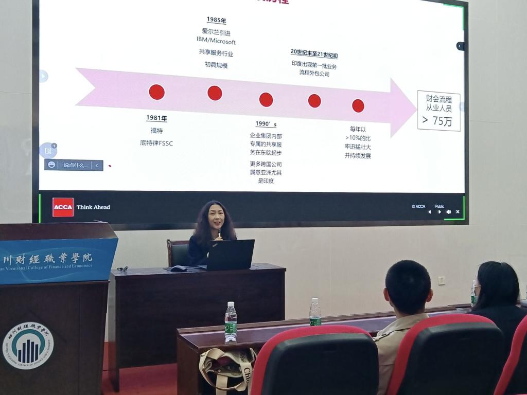 最后,会计学院副院长朱敏向同学们详细介绍了ACCA、博世、财院三方联合订单班的具体合作模式。订单班学生将获得学校、ACCA、博世三方共同支持。我院根据博世岗位需求,进行课证融合;ACCA将为订单班学生提供实践专家讲座;学生顺利完成订单班课程学习,并取得ACCA全球共享服务资格证书 GBS Certificate后,将进入博世成都财务共享服务中心进行8个月的带薪实习,获得博世公司的实习证明。实习结束后,优秀学生有机会获得全职工作机会。