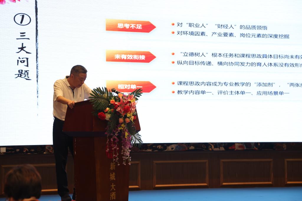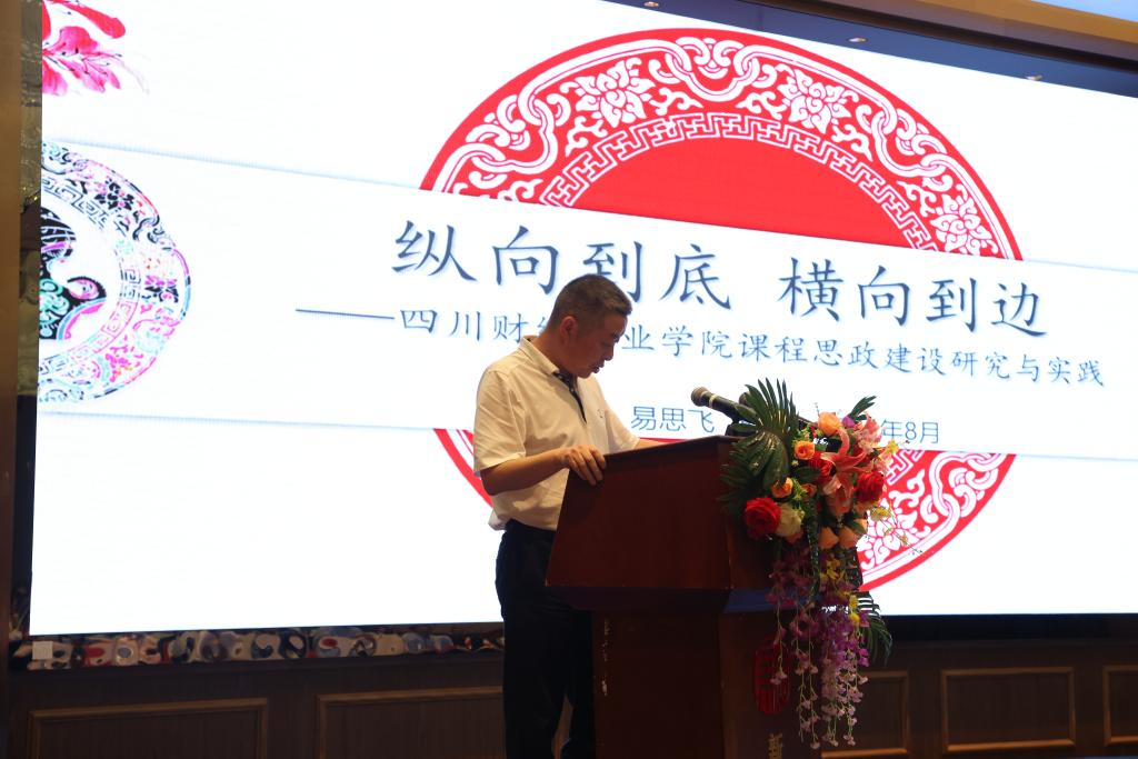 会上,易思飞副院长作了题为《四川财经职业学院“纵向到底,横向到边”课程思政建设研究与实践》主题报告。针对课程思政存在三大问题,即:对三层递进的价值引领思考不足,特别是对“职业人”“财经人”的品质领悟,缺乏对环境因素、产业要素、岗位元素的深度挖掘;“立德树人”根本任务和课程思政具体目标尚未有效衔接,纵向目标传递、横向协同发力的育人体系没有效形成;课程思政内容成为专业教学的“添加剂”,“两张皮”严重,教学内容单一、评价主体单一、应用场景单一。四川财经职业学院遵循“价值引领,同向同行,凝心聚力”的课程思政建设原则,印发《四川财经职业学院课程思政建设实施方案(2021-2023年)》,以培养精业致能、理财至诚的财经类高素质职业人为己任,构建起“社会人—职业人—财经人”三层递进“品质模型”,拓展相对应的“品质图谱”,形成“三层递进、纵向到底、横向到边”的全域型课程思政建设体系。