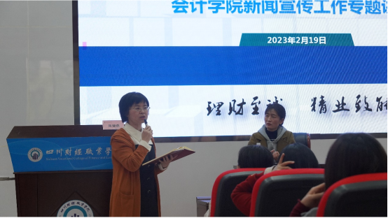 为深入学习贯彻习近平总书记关于推动媒体融合发展的重要论述,创新推动学院网络文化建设工作和网络宣传能力,会计学院特邀西南交通大学党委宣传部新媒体中心主任朱莹燕老师于2023年2月19日,在我校至诚楼210教室召开新闻宣传工作与新媒体运营技能讲座。学院党总支书记院长李代俊、副院长陈娟、办公室主任江春燕,新媒体中心负责人罗兰杰老师出席,学院负责宣传的教师以及新媒体中心全体成员参加讲座。