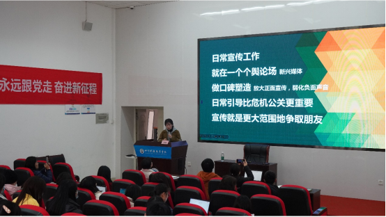 朱莹燕老师重点围绕新闻写作技巧、新媒体传播特点、网络舆情应对、等内容进行授课;并结合自身深厚的理论积淀、丰富的实战经验和大量的真实案例,讲授了新媒体传播的方式与技巧。同时提出要重新审视新闻宣传工作,即宣传就是更大范围地去争取朋友。还要弄清新闻宣传的首要核心是从用户的思维出发。高校的思想政治工作就要运用新媒体新技术使之“活”起来,推动其传统优势同信息技术的高度融合,增强时代感和吸引力。