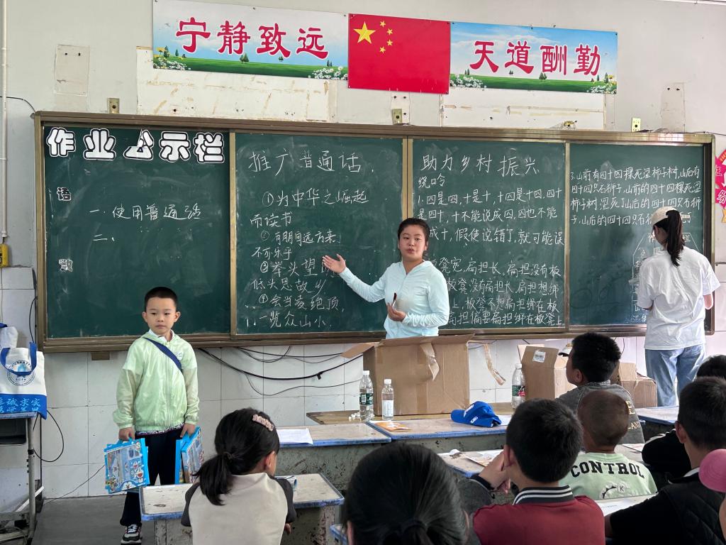 实践队赴喜德县冕宁镇深沟小学,为学生们组织了一次“推普小课堂”。小课堂从成语接龙、绕口令等趣味活动开始,接着通过互动的方式纠正学生们前后鼻音、平翘舌音不分等问题,并鼓励大家加强日常练习、主动运用标准普通话、养成规范语言的使用习惯。最后,实践队成员与学生们一起阅读中国经典诗词,感受中华文化的丰富内涵和深厚底蕴。实践队还为学生们准备了文具,生活用品等礼品。