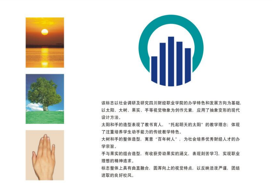 校徽标志以社会调研及研究四川财经职业学院的办学特色和发展方向为基础,以太阳、大树、果实、手等视觉物象为创作元素,应用了抽象变形的现代设计方法。